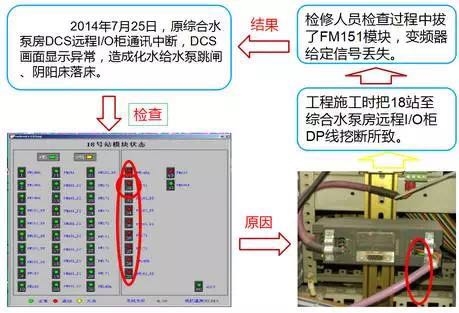 2014年7月25日,原综合水泵房DCS远程I/O柜通讯中断,DCS画面显示异常,造成化水给水泵跳闸、阴阳床落床。