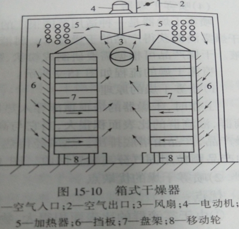 箱式干燥机主要是以热风通过物料的表面而达到干燥的目的。它为间歇式操作,适用于干燥时间较长和数量不多的物料。通常物料装盘用人工放入干燥器支架上,或置于小推车上送入箱内。物料的厚度为10~100nm,热空气的流速为0.5~10m/s。箱式干燥机结构如图所示。