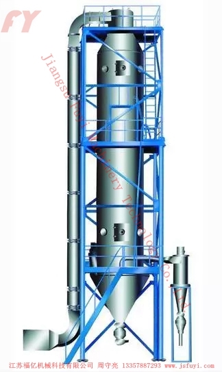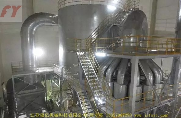 空气经过滤和加热,进入干燥器顶部空气分配器,热空气呈螺旋状均匀地进入干燥室。料液经塔体顶部的高速离心雾化器,(旋转)喷雾成极细微的雾状液珠,与热空气并流接触在极短的时间内可干燥为成品。成品连续地由干燥塔底部和旋风分离器中输出,废气由风机排空。