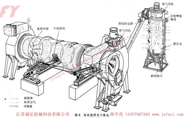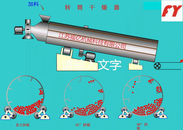 回转圆筒干燥机的主体是沿轴向装有若干抄板的圆筒。圆筒略呈倾斜放置,在齿轮机构的驱动下作旋转运动。