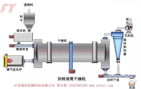 湿物料从干燥机一端投入后,在内筒均布的抄板器翻动下,物料在干燥器内均匀分布与分散,并与并流(逆流)的热空气充分接触,加快了干燥传热,传至推动力。在干燥过程中,物料在带有倾斜度的抄板和热气流的作用下,可调控地运动至干燥机另一段星形卸料阀排出成品。