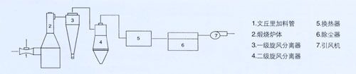 气体经加热炉加热至物料煅烧温度后,利用文丘里原理带进煅烧物料至煅烧炉内(高温热气体与物料一起切向进入炉主体内),在煅烧炉主体下部物料与热气得到充分混合,使物料温度瞬间达到煅烧温度后由气体夹带上升,完成煅烧。然后煅烧后的物料与尾气一起进入收集、换热装置,换热后的尾气再经除尘器后排空,换热得到的热量,进行回收利用。