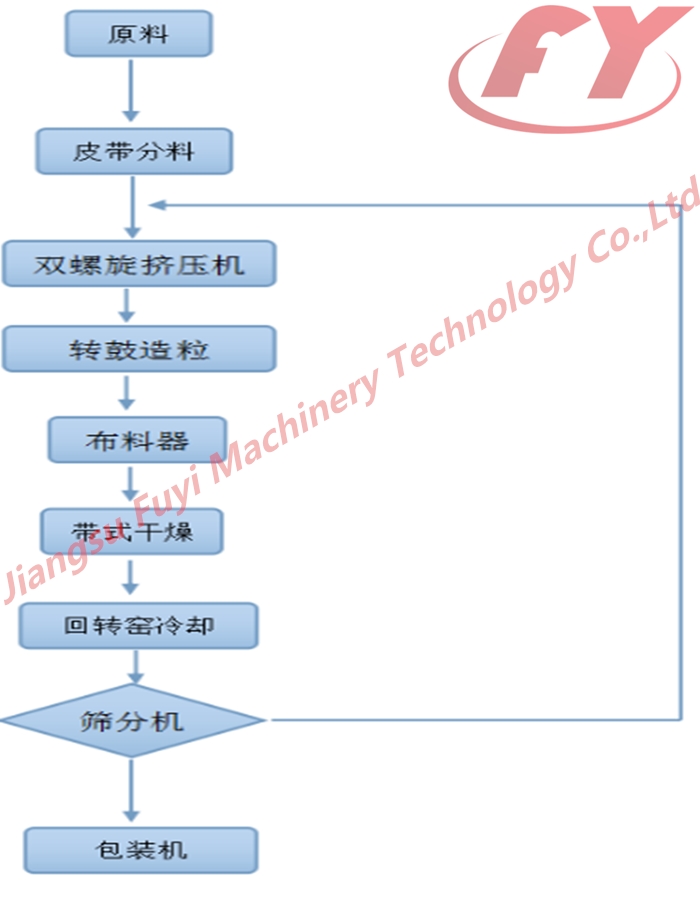本方案的工艺流程是“混合挤出- 造粒- 干燥- 筛分–冷却- 包装”所经设备为: 双螺旋挤压机---转鼓造粒(或称滚筒造粒机)---布料器---带式干燥---回转窑冷却---筛分机---双称包装机。