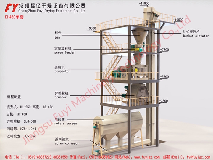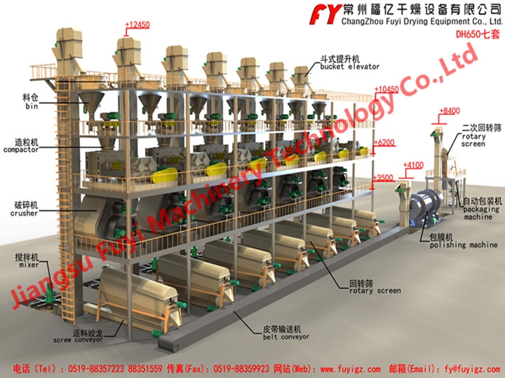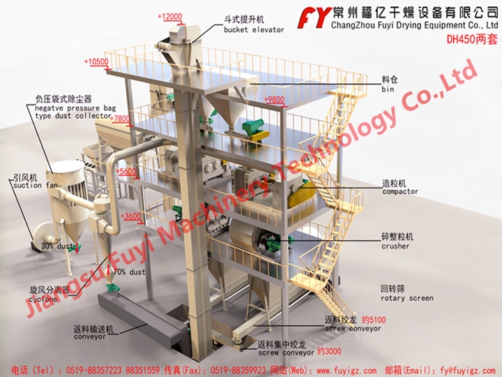 产品概述:DH450型一台时产1.8~2.5吨,DH650型一台时产3.5~4吨,产量按氯化钾计算的.不同物料产量有所不同。另外DH系列还有DH240、DH360、DH800、DH1000等多种机型,具体布置方案我公司技术人员可根据用户要求,做详细设计.