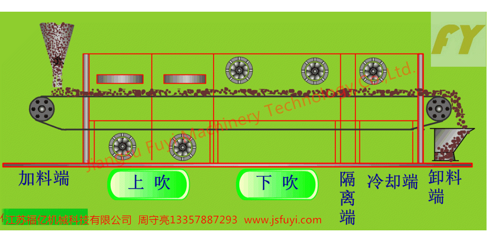 工作原理: 物料由加料器均匀地铺在网带上,网带一般采用12-60目不锈钢丝网,由传动装置拖动在干燥机内移动。干燥机由若干单元组成,每一单元热风独立循环,部分尾气由专门排湿风机排出,废气由调节阀控制,热气由下往上或由上往下穿过铺满物料的网带完成热量与质量传递的进程,带走物料水份。网带缓慢移动,运行速度可根据物料温度自由调节,干燥后的成品连续落入收料器中。上下循环单元根据用户需要可灵活配备,单元数量亦可根据需要选取。