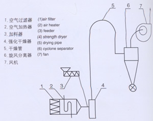(2)干燥时间短。物料在干燥器内一般只停留0.5~2s,故即使干燥介质温度较高,物料温度也不会升的太高。因此,适用于热敏性、易氧化物料的干燥。