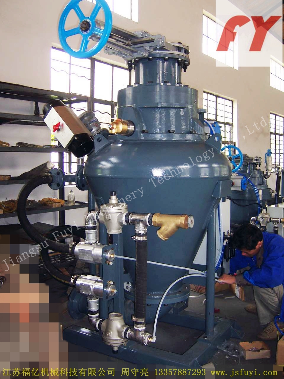 进料过程中,物料通过钟罩阀、双蝶阀或膨胀式蝶阀在重力作用下被加进发送罐中,置换出的空气通过排气阀被释放出去,使得进料更加容易。一旦发送罐被装满(通过料位计或称重显示物料达到罐容积的80%),进料阀和排气阀立即自动关闭并密封,而后高压气体通过发送罐顶部和流化喷嘴被逐渐加入,加入罐中的气体与物料相混合,当罐内压力达到设定值后自动打开出料阀,此时物料在输送管线中以流动状态被加压,直到发送罐和输送管线全部排空。当发送罐内的压力降为零时,气体供给阀门即被关闭,同时剩余气体也被排出发送罐和输送管线。