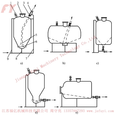 沸腾式气力输送装置可根据发送罐底部流化板的结构、材质、安装位置来设计输料管的出料方式。按发送罐上的出料位置,大致分上引式、和侧引式。由于发送罐内物料的流化状态不同会造成输料管的不稳定性,输送能力、混合比等参数也会发生相应变化。根据实验表明,在输送距离不长的情况下,采用上引式较好。输送管铅直上升高度应保持在5m以上,使物料从加速流动进入稳定流动。