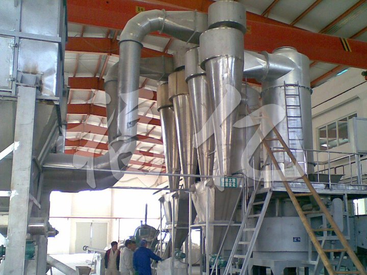 热空气由进风口以适宜的喷动速度从干燥机底部进入搅拌粉碎干燥室,对物料强烈的剪切、吹浮、旋转作用,于是物料受到离心、剪切、碰撞、磨擦而被微粒化,强化了传质传热。在干燥机底部,较大较湿颗粒团在搅拌器的作用下被机械破碎,湿含量较低、颗粒度较小的颗粒被旋转气流夹带上升,在上升的过程中进一步干燥,由于气固相作旋转流动,固相惯性大于气相,固气两相间的相对速度较大,强化两相间的传热效果,所以该机干燥强度高。